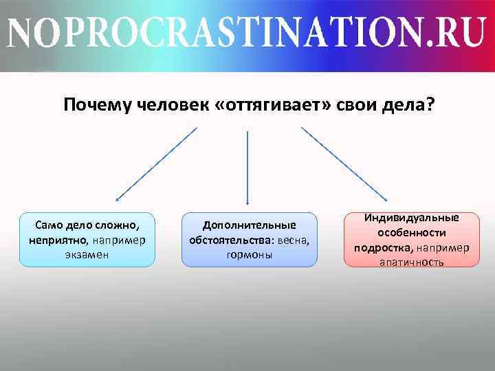 Почему человек «оттягивает» свои дела? Само дело сложно, неприятно, например экзамен Дополнительные обстоятельства: весна, гормоны Индивидуальные особенности подростка, например апатичность