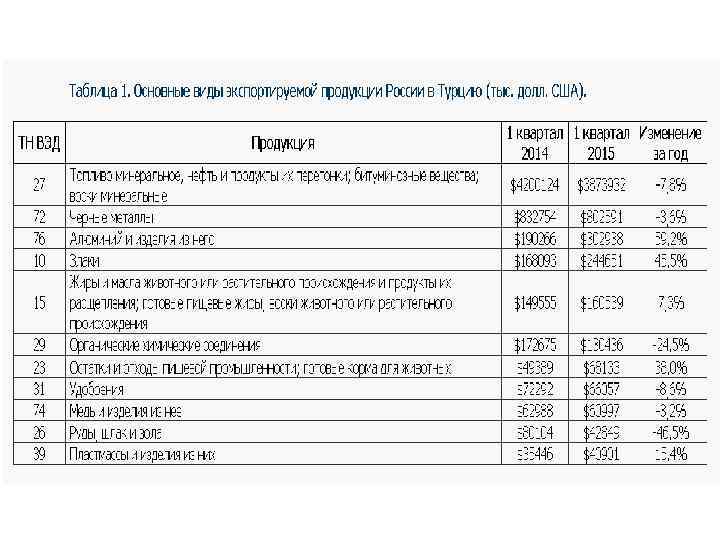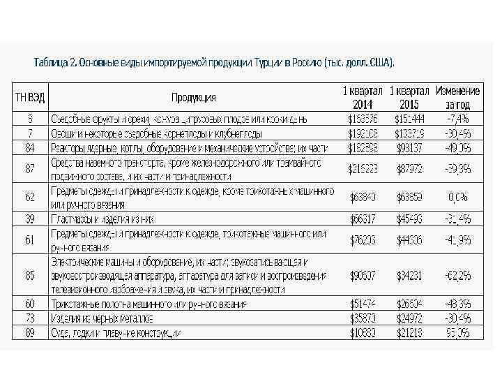 Импорт турецких товаров в Россию в первом квартале 2015 г. • Съедобные фрукты и орехи(14, 9%) • Овощи и некоторые съедобные корнеплоды и клубнеплоды (13, 2%) • Реакторы ядерные, котлы, оборудование и механические устройства; их части (9, 2%) • Средства наземного транспорта, кроме железнодорожного или трамвайного подвижного состава, и их части и принадлежности (8, 7%) • Предметы одежды и принадлежности к одежде, кроме трикотажных машинного или ручного вязания (6, 3%) • Пластмассы и изделия из них (4, 5%) • Предметы одежды и принадлежности к одежде, трикотажные машинного или ручного вязания (4, 4%) • Электрические машины и оборудование, их части; звукозаписывающая и звуковоспроизводящая аппаратура, аппаратура для записи и воспроизведения телевизионного изображения и звука, их части и принадлежности (3, 4%) • Трикотажные полотна машинного или ручного вязания (2, 6%) • Изделия из черных металлов (2, 5%) • Суда, лодки и плавучие конструкции (2, 1%)