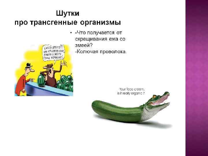 Что несет человечеству генная инженерия? Не исключено, что трансгенные организмы, «вырвавшись из пробирки на свободу» , смогут бесконтрольно и неограниченно размножаться, что может привести к катастрофам. Такие опасения заставили ученых разработать чрезвычайно строгие меры безопасности проведении экпериментов ( в их числе и биологическая защита- создание микроорганизмов, способных жить только в искусственных условиях лаборатории).