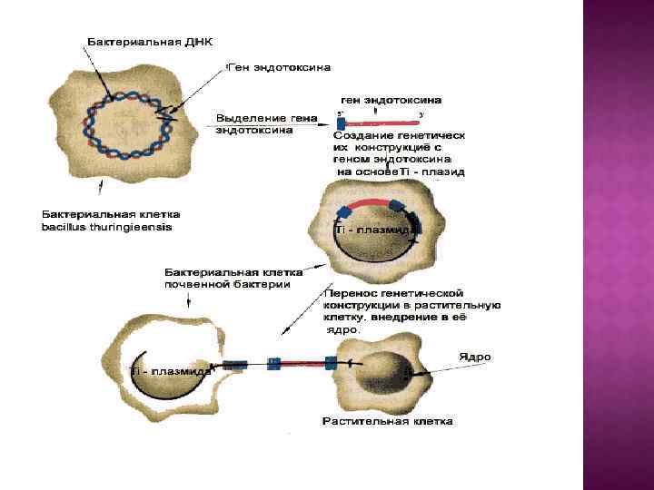 Основные этапы решения генноинженерной задачи : 1. Получение изолированного гена. 2. Введение гена в вектор для переноса в организм. 3. Перенос вектора с геном в модифицируемый организм. 4. Преобразование клеток организма. 5. Отбор генетически модифицированных организмов (ГМО) и устранение тех, которые не были успешно модифицированы.