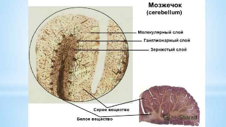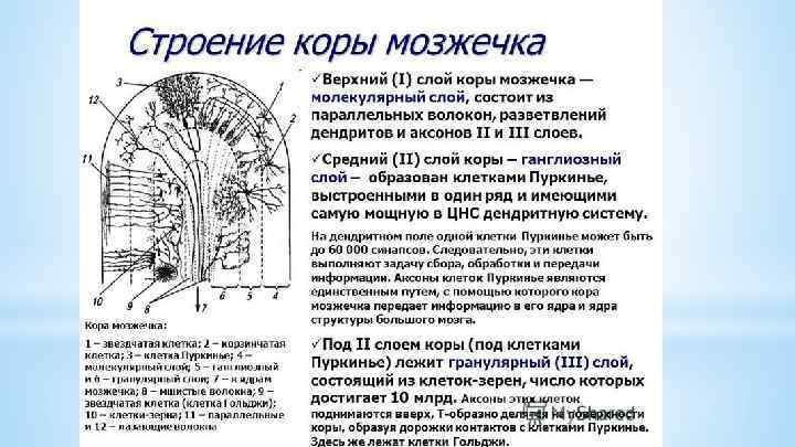 Ганглиозный (ганглионарный, слой грушевидных клеток или клеток Пуркинье) – главный слой коры мозжечка. Грушевидные клетки являются ассоциативно-эфферентными, от них начинаются эфферентные пути мозжечка. Нейроны этого слоя имеют грушевидную форму и располагаются в 1 ряд поперечно извилине. Высота тела грушевидного нейрона составляет 60 мкм, от их вершины отходят в вышележащий молекулярный слой 2 -3 сильно ветвящихся дендрита. От основания грушевидных клеток отходит аксон, который, проходя по зернистому слою, отдает коллатерали, направленные снова к грушевидным клеткам и объединяя соседствующие клетки своими контактами. Основная веточка аксона, дающая начало нисходящему (эфферентному) пути, направляется к одному из ядер мозжечка и заканчивается синапсом на его нейронах. * Рис. 2. Строение коры мозжечка. 1 – молекулярный, 2 – ганглиозный и 3 – зернистый слои; 4 – белое вещество.