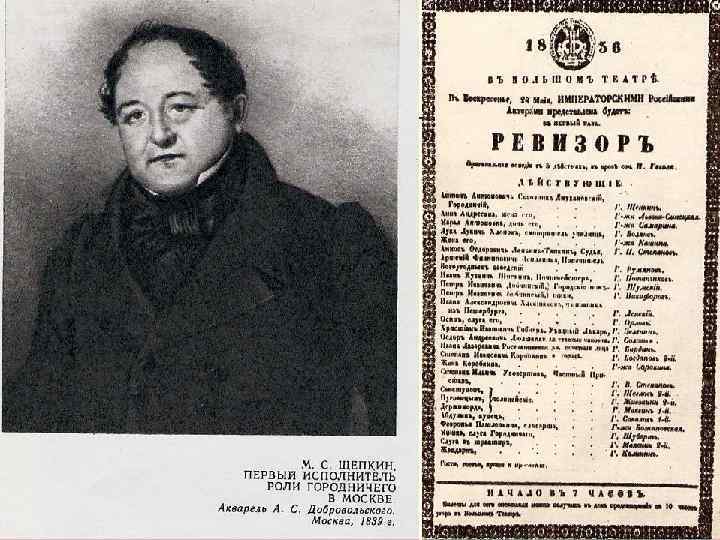 Первое представление «Ревизора» состоялось 19 апреля в 1836 году на сцене Александринского театра в Петербурге. Роль городничего играл Михаил Семенович Щепкин, великий русский актер.