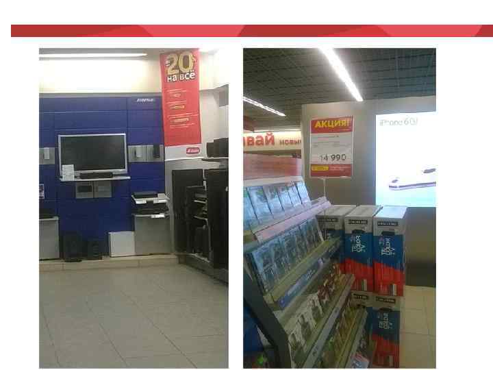 Показатель М. Видео Эльдорадо Медиа. Маркт 1. Расположение магазина 10 (место расположения, часы работы, наличие транспортных узлов, наличие парковки) 9 9 1. Планировка(удобство и рациональность расположения 10 оборудования, высота оборудования, ширина проходов) 7 8 1. Дизайнерское решение (вывеска, логотип, дизайн торгового зала, дизайн формы) Ассортимент (ширина/глубина, постоянство, обновляемость, наличие собственных ТМ) Качество продукции (состояние упаковки, внешний вид, сроки годности) Выкладка(наполненность полок, удобство расположения товара, наличие ценников) Общий уровень цен Ценовое стимулирование(скидки, акции, дисконтные программы) Неценовое стимулирование(подарки, конкурсы, бонусные карты) Услуги(смс-оповещение, безналичная оплата, упаковка, наличие интернет-магазина) 10 3 6 10 5 7 10 7 8 10 6 8 9 10 9 8 7 7 9 8 8 10 7 8 4 6 80 90 1. 1. Персонал (наличие в вид, коммуникационные навыки) 1. Атмосфера(освещение, звуковое оформление, наличие 10 посторонних запахов, температура) Итого: зале, внешний 9 117