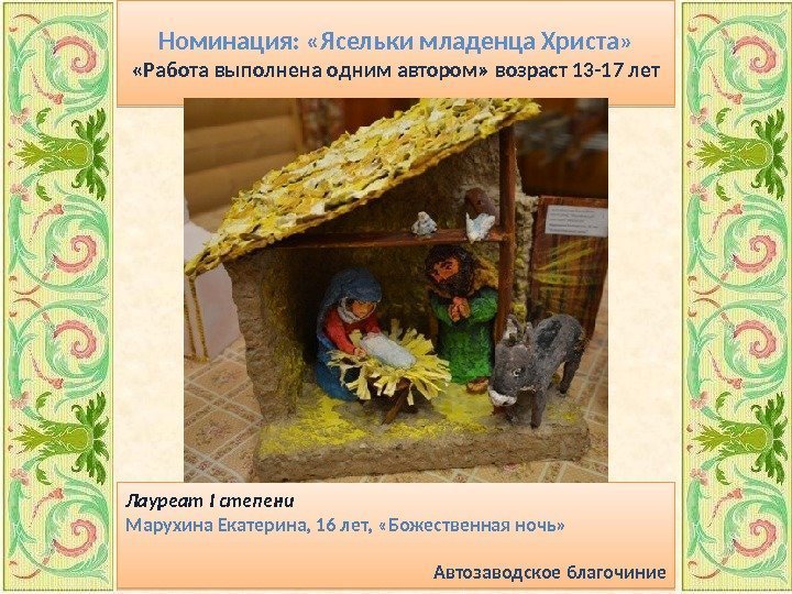 Номинация: «Ясельки младенца Христа» «Работа выполнена одним автором» возраст 13 -17 лет Лауреат I степени Марухина Екатерина, 16 лет, «Божественная ночь» Автозаводское благочиние