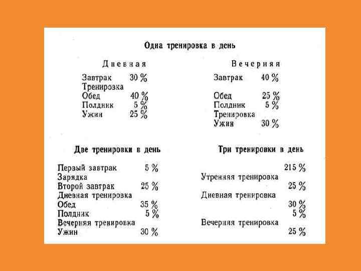 Если основные тренировочные занятия или соревнования происходят во второй половине дня (между обедом и ужином), обед должен состоять из продуктов, не обременительных для желудка. Продукты, богатые клетчаткой, включают в пищевой рацион ужина, а продукты, долго задерживающиеся в желудке, — в завтрак. Относительная калорийность обеда снижается до 30— 35%, калорийность завтрака и ужина соответственно повышается.