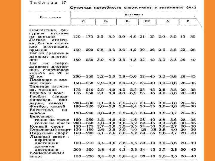 Суточная потребность спортсменов в витаминах в разные периоды тренировочного цикла, мг (по Н. Н. Яковлеву) Вид деятельност и Спортсмены, выполняющие кратковременные Спортсмены, выполняющие длительные нагрузки на скоростные и силовые нагрузки (спринтеры, выносливость метатели, прыгуны, гимнасты, тяжелоатлеты и т д. ) B 1 В 2 РР Е С А В 1 В 2 РР Е С А Активный от дых 2, 5 2 20 3 75 2 3 2 20 3 100 2 Тренировки 5 2, 5 20 3 150 3 10 5 25 6 250 3 Соревновани я 10 5 25 3 250 2 15 5 25 6 300 2