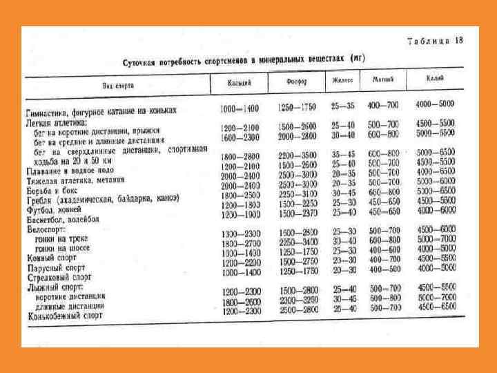 Натрий — основной микроэлемент, поддерживающий осмотическое давление крови, лимфы, тканевых жидкостей. Человек потребляет его в виде хлористого натрия (поваренной соли) в количестве 6 12 г/сут; при тренировках в условиях высоких температур, приводящих к выделению большого количества пота и потере натрия суточная потребность в хлористом натрии у спортсмена возрастает до 30 35 г. Кальций входит в состав костей, зубов, ионы кальция принимают участие в процессах свертываемости крови, он играет важную роль в обеспечении функции нервно мышечной возбудимости и в ряде других биологических процессов. Основные пищевые источники кальция: молоко и молочные продукты, капуста, шпинат и др. Суточная норма потребления кальция для взрослых — 0, 8 г, для детей — 1, для подростков — 1, 5, для спортсменов скоростно силовых видов спорта — 2 2, 5 г, а в видах спорта, требующих значительной физической выносливости, — 1, 8 2, 0 г.