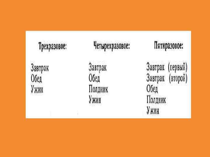 Общие гигиенические требования к режиму питания • Функциональное состояние организма человека, уровень его умственной и физической работоспособности во многом зависят не только от общей калорийности дневного рациона, но и от рацио нального аспорядка приема пищи в течение р суток. У взрослых 3 4 приема пищи; у детей дошкольного возраста — 4 5. Три основных приема пищи — завтрак, обед и ужин; четвертым может быть второй завтрак (между завтраком и обедом) или полдник (между обедом и ужином) в зависимости от традиций и условий жизни.