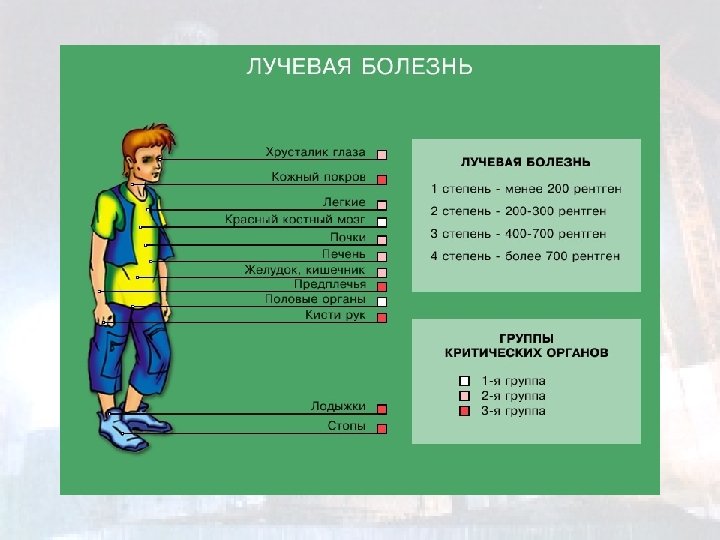 Движение по зараженной радиоактивными веществами местности При движении по зараженной радиоактивными веществами местности необходимо 1) находиться в средствах индивидуальной защиты органов дыхания и кожи; 2) без надобности не садиться и не прикасаться к местным предметам; 3) избегать движения по высокой траве и кустарнику; 4) не принимать пищу, не пить, не курить; 5) не поднимать пыль и не ставить вещи на землю. Находясь в зоне радиоактивного заражения, человек облучается и в результате у него может возникнуть лучевая болезнь.