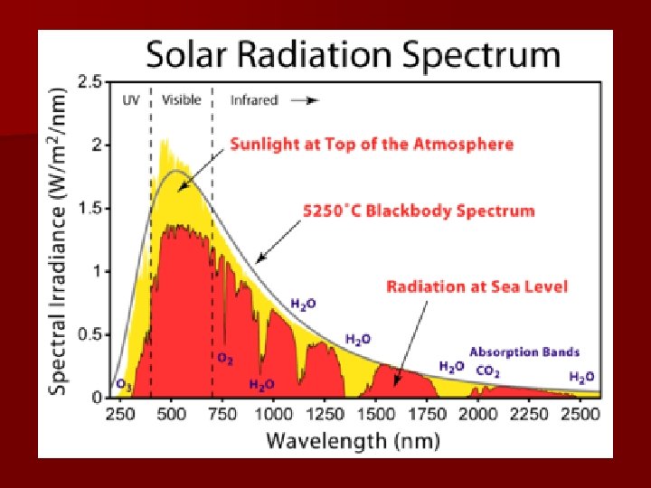 Radiasi Gelombang pendek dan panjang n n n Panjang gelombang semakin pendek bila suhu permukaan yang memancarkan radiasi tersebut lebih tinggi Matahari (suhu 6000 K) mempunyai kisaran panjang gelombang antara 0. 3 – 4. 0 μm Bumi suhu 300 K (27 o. C) memancarkan radiasi dengan panjang gelombang 4 – 120 μm, Karena panjang gelombang radiasi surya relatif pendek dibandingkan benda-benda alam lainnya maka disebut radiasi gelombang pendek. Radiasi bumu/benda-benda yang ada dibumi disebut radiasi gelombang panjang.