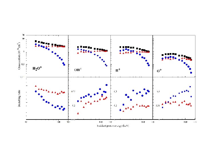 Ionisation de molécules d’eau par impact de d’atome d’hydrogène(20 -150 ke. V) • • • Section efficace totale d’ionisation Ionisation sans perte d’électron par le projectile H + H 2 O H+ + (H 2 O +)* + 2 e. Ionisation avec perte d’électron par le projectile H + H 2 O H + (H 2 O +)* + e-