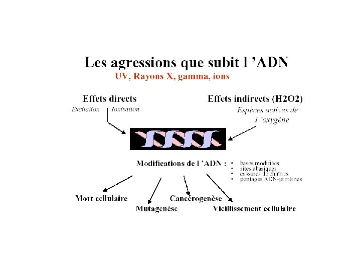 Dommages radio-induits dans la matière biologique Enjeux des études à l’échelle moléculaire Quelles études ? L’enjeu principal est de faire le lien entre les développements récents de l’étude des molécules biologiques en phase gazeuse et la radiobiologie. Mesures sur des molécules isolées Il est possible d’isoler en phase gazeuse des bases de l’ADN ou de l’ARN mais aussi des nucléotides, des fragments d’ADN ou d’autres éléments de la matière biologique. Ceci permet d’apporter des informations quantitatives sur les premières étapes de l’action des rayonnements ionisants. Mesures sur des agrégats de molécules biologiques et de molécules d’eau Il s’agit d’associer les développements de la physique des agrégats à ceux de l’étude des molécules biologiques en phase gazeuse. Il est possible de produire et de caractériser en laboratoire des agrégats de molécules biologiques entourées d’un nombre donné de molécules d’eau. L’enjeu est de comprendre l’interaction entre les molécules sous l’action des rayonnements ionisants.