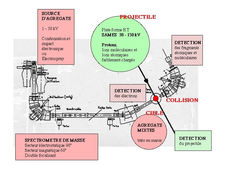 RADIATION DAMAGE IN BIOMOLECULAR SYSTEMS Proton impact on biomolecules and on clusters of biomolecules DNA CLUSTER OF NUCLEOTIDES AND WATER THE GOALS SWIFT PROTON The velocity of the protons corresponds to the Bragg peak (Protontherapy) The main objective isto study the irradiation of cellular materials and to provide, in a comprehensive manner, missing information about the molecular pathways that lead from initial deposition of energy to base modification and strand breaks in DNA. Expériences sur les molécules isolées