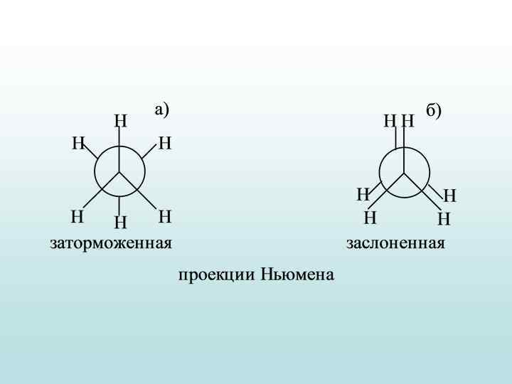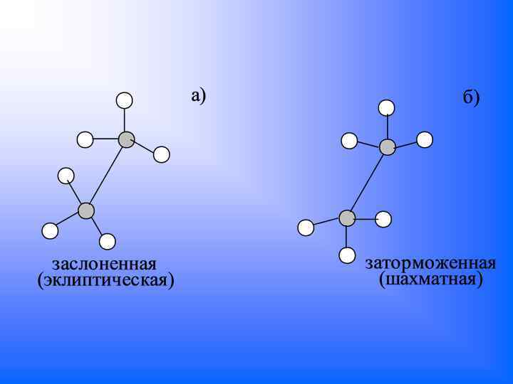 а) В заслоненной конформации (эклиптической) все атомы водорода лежат на одной линии, расстояние между водородами минимальные. б) В заторможенной (шахматной) конформации максимальное несовмещение водородов. Это конформация выгоднее энергетически, т. к. удаление между водородами максимальное, следовательно, меньше.