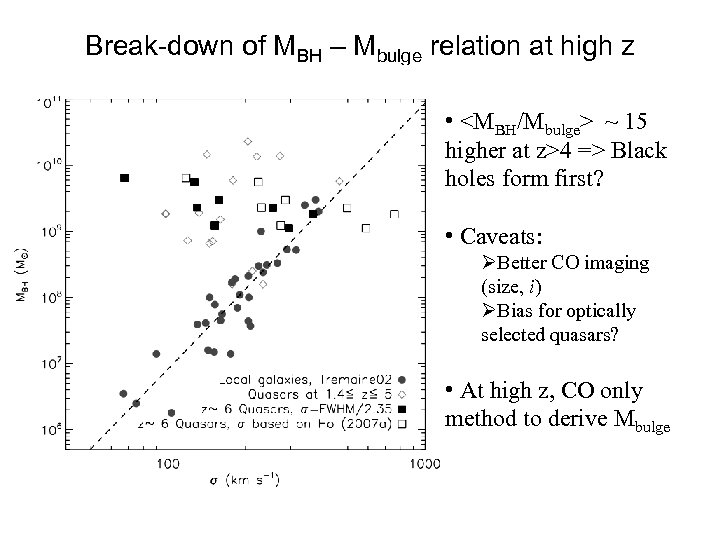 Break-down of MBH – Mbulge relation at high z • <MBH/Mbulge> ~ 15 higher at z>4 => Black holes form first? • Caveats: ØBetter CO imaging (size, i) ØBias for optically selected quasars? • At high z, CO only method to derive Mbulge