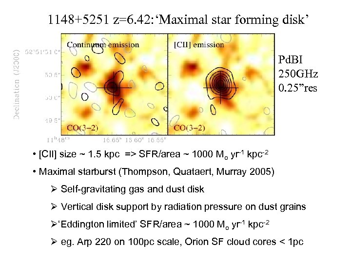 1148+5251 z=6. 42: ‘Maximal star forming disk’ Pd. BI 250 GHz 0. 25”res • [CII] size ~ 1. 5 kpc => SFR/area ~ 1000 Mo yr-1 kpc-2 • Maximal starburst (Thompson, Quataert, Murray 2005) Ø Self-gravitating gas and dust disk Ø Vertical disk support by radiation pressure on dust grains Ø‘Eddington limited’ SFR/area ~ 1000 Mo yr-1 kpc-2 Ø eg. Arp 220 on 100 pc scale, Orion SF cloud cores < 1 pc