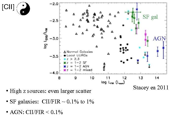 [CII] SF gal AGN • High z sources: even larger scatter • SF galaxies: CII/FIR ~ 0. 1% to 1% • AGN: CII/FIR < 0. 1% Stacey ea 2011