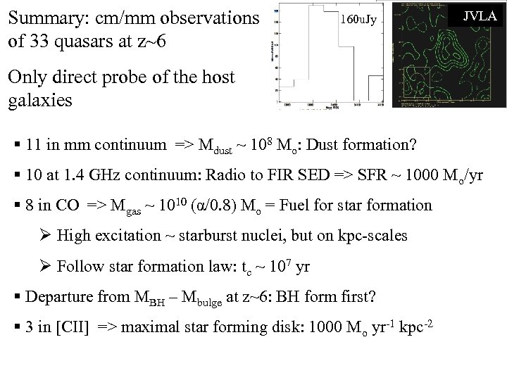 Summary: cm/mm observations of 33 quasars at z~6 160 u. Jy JVLA Only direct probe of the host galaxies J 1425+3254 CO at z = 5. 9 § 11 in mm continuum => Mdust ~ 108 Mo: Dust formation? § 10 at 1. 4 GHz continuum: Radio to FIR SED => SFR ~ 1000 Mo/yr § 8 in CO => Mgas ~ 1010 (α/0. 8) Mo = Fuel for star formation Ø High excitation ~ starburst nuclei, but on kpc-scales Ø Follow star formation law: tc ~ 107 yr § Departure from MBH – Mbulge at z~6: BH form first? § 3 in [CII] => maximal star forming disk: 1000 Mo yr-1 kpc-2
