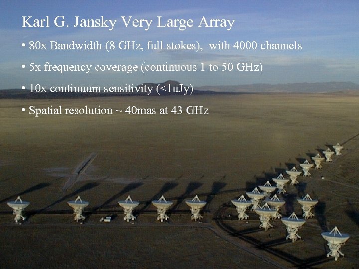Karl G. Jansky Very Large Array • 80 x Bandwidth (8 GHz, full stokes), with 4000 channels • 5 x frequency coverage (continuous 1 to 50 GHz) • 10 x continuum sensitivity (<1 u. Jy) • Spatial resolution ~ 40 mas at 43 GHz