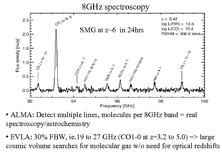 8 GHz spectroscopy SMG at z~6 in 24 hrs • ALMA: Detect multiple lines, molecules per 8 GHz band = real spectroscopy/astrochemistry • EVLA: 30% FBW, ie. 19 to 27 GHz (CO 1 -0 at z=3. 2 to 5. 0) => large cosmic volume searches for molecular gas w/o need for optical redshifts