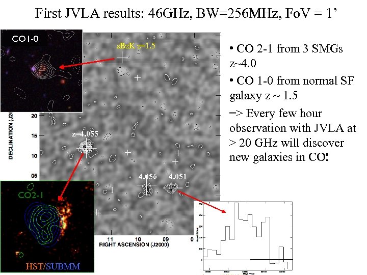 First JVLA results: 46 GHz, BW=256 MHz, Fo. V = 1’ CO 1 -0 • CO 2 -1 from 3 SMGs z~4. 0 • CO 1 -0 from normal SF galaxy z ~ 1. 5 => Every few hour observation with JVLA at > 20 GHz will discover new galaxies in CO! s. Bz. K z=1. 5 z=4. 055 4. 056 CO 2 -1 HST/SUBMM 4. 051