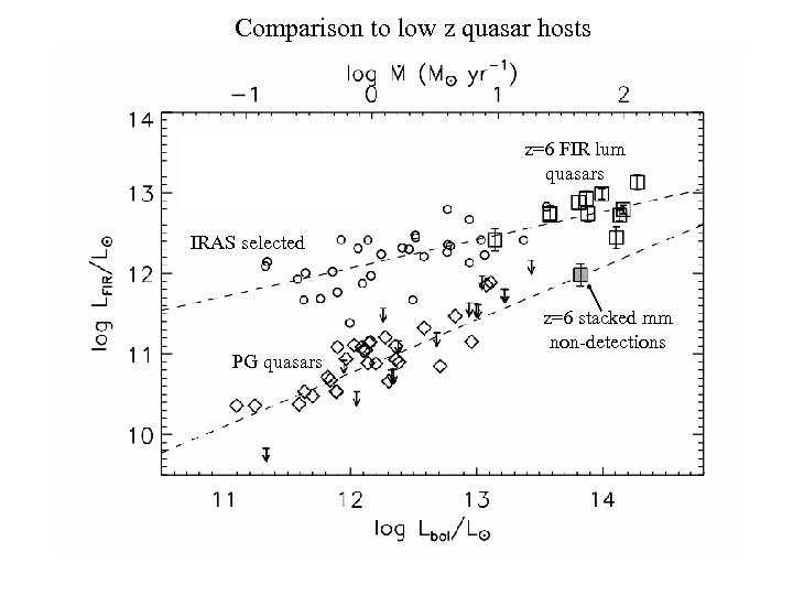 Comparison to low z quasar hosts z=6 FIR lum quasars IRAS selected PG quasars z=6 stacked mm non-detections