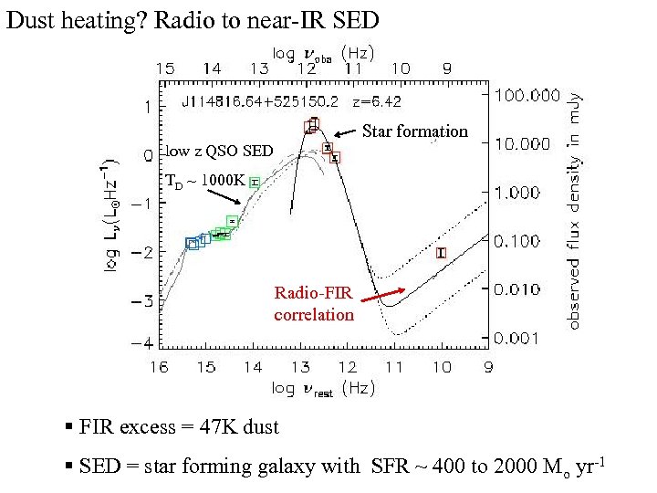 Dust heating? Radio to near-IR SED Star formation low z QSO SED TD ~ 1000 K Radio-FIR correlation § FIR excess = 47 K dust § SED = star forming galaxy with SFR ~ 400 to 2000 Mo yr-1
