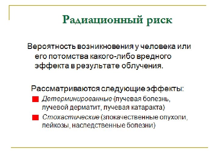 Radiation hormesis (homeostasis) Эффект от малых доз ионизирующего излучения (на уровне естественного фона), стимулирующий как активация механизмов восстановления, так и защищающий от различных заболеваний и не проявляющийся в отсутствии радиации