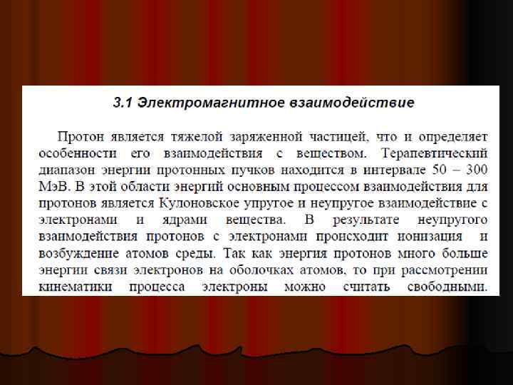 Взаимодействие электронов с веществом Электрон является легкой заряженной частицей. Он имеет единичный элементарный отрицательный заряд, а его масса равняется примерно 1/2000 массы атома водорода. Эти свойства и определяют специфику взаимодействия электронов с атомами окружающей среды. Проходя через вещество, электроны испытывают кулоновские силы взаимодействия с атомами, в результате чего теряют свою энергию на упругие и неупругие столкновения до тех пор, пока их энергия не снизится до тепловой, когда частицы можно считать остановившимися.