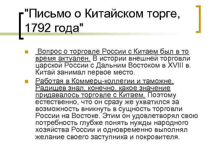 "Письмо о Китайском торге, 1792 года" n n Вопрос о торговле России с Китаем был в то время актуален. В истории внешней торговли царской России с Дальним Востоком в XVIII в. Китай занимал первое место. Работая в Коммерц-коллегии и таможне, Радищев знал, конечно, какое значение придавалось торговле с Китаем. Поэтому естественно, что он сразу же ухватился за возможность вникнуть в сущность торговли России на Востоке. Этим он удовлетворял свою потребность глубже понять нужды народного хозяйства России и одновременно выполнял желание своего заступника и покровителя.