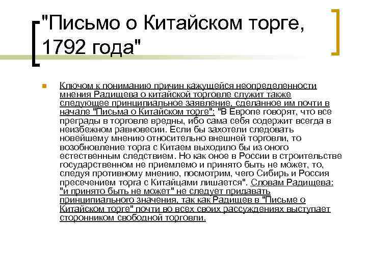 "Письмо о Китайском торге, 1792 года" n Ключом к пониманию причин кажущейся неопределенности мнения Радищева о китайской торговле служит также следующее принципиальное заявление, сделанное им почти в начале "Письма о Китайском торге": "В Европе говорят, что все преграды в торговле вредны, ибо сама себя содержит всегда в неизбежном равновесии. Если бы захотели следовать новейшему мнению относительно внешней торговли, то возобновление торга с Китаем выходило бы из оного естественным следствием. Но как оное в России в строительстве государственном не приемлемо и принято быть не может, то, следуя противному мнению, посмотрим, чего Сибирь и Россия пресечением торга с Китайцами лишается". Словам Радищева: "и принято быть не может" не следует придавать принципиального значения, так как Радищев в "Письме о Китайском торге" почти во всех своих рассуждениях выступает сторонником свободной торговли.