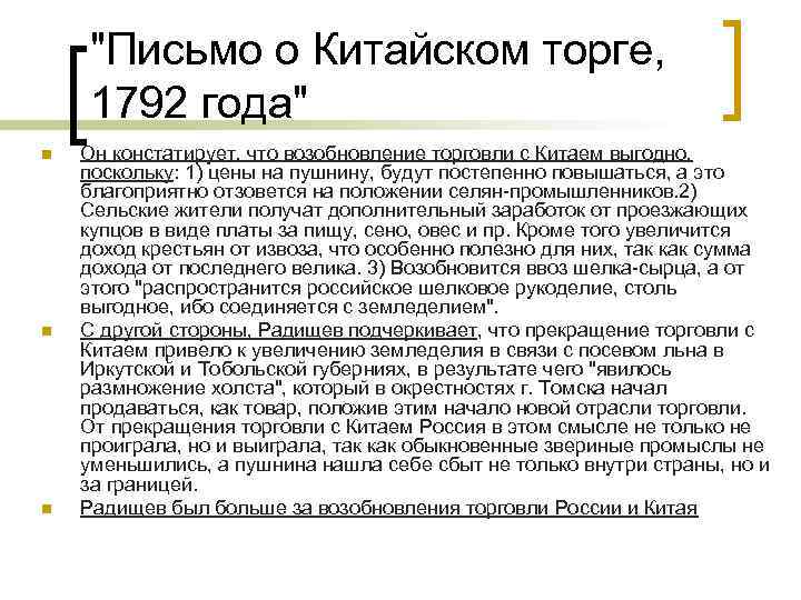 "Письмо о Китайском торге, 1792 года" n n n Он констатирует, что возобновление торговли с Китаем выгодно, поскольку: 1) цены на пушнину, будут постепенно повышаться, а это благоприятно отзовется на положении селян-промышленников. 2) Сельские жители получат дополнительный заработок от проезжающих купцов в виде платы за пищу, сено, овес и пр. Кроме того увеличится доход крестьян от извоза, что особенно полезно для них, так как сумма дохода от последнего велика. 3) Возобновится ввоз шелка-сырца, а от этого "распространится российское шелковое рукоделие, столь выгодное, ибо соединяется с земледелием". С другой стороны, Радищев подчеркивает, что прекращение торговли с Китаем привело к увеличению земледелия в связи с посевом льна в Иркутской и Тобольской губерниях, в результате чего "явилось размножение холста", который в окрестностях г. Томска начал продаваться, как товар, положив этим начало новой отрасли торговли. От прекращения торговли с Китаем Россия в этом смысле не только не проиграла, но и выиграла, так как обыкновенные звериные промыслы не уменьшились, а пушнина нашла себе сбыт не только внутри страны, но и за границей. Радищев был больше за возобновления торговли России и Китая