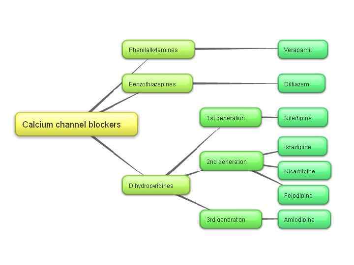 Calcium channel blockers comprise three chemical groups, all of them bind the L-type Ca++ channel, but each class binds to different binding sites of the same channel: Phenilalkylamines: verapamil is the only drug in this group, it binds to the V binding site. Benzothiazepines: diltiazem binds to the D binding site in the L-type Ca++ channel. It shows cardiovascular effects similar to those of verapamil. Dihydropyridines: the prototype agent in this group is nifedipine, a first generation dihydropyridine that binds to the N binding site. Second generation agents include isradipine, nicardipine, and felodipine. Amlodipine is considered a third generation dihydropyridine.