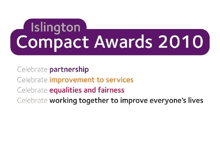 NHS Islington • Ongoing top-level involvement in developing and promoting the Compact and implementing the action plan. e. g. online, at events, at meetings • Staff benefit from the high profile given to the Compact = clear guidance on cross-sector working and how it can help fulfil health targets. Community groups benefit from shared training and other partnership work • Chair is a Compact Champion