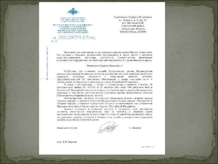 Карта исследования. № Источник информации Форма сбора Документы материала 1 Колошин Виктор интервью Иванович 3 в г. Подольск начальнику рассказ о военных годах отца описание Запрос в архив Центрального Архива Министерства Обороны. 4 Мемориал. ru Поиск информации интернет 5 Поиск карт времен В. О. в Поиск информации интернет 6 Изучение исторических событий. 1. Советская военная энциклопедия. Второе издание. В восьми томах. М. , 1990. Т. 1. С. 458 поселковая библиотека 2. Военные действия в районе Ржевско – Вяземского выступа в январе 1942 – марте 1943 гг: Ржевская битва. 2002 г. Школьная библиотека,