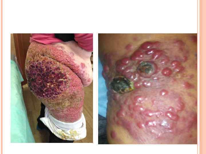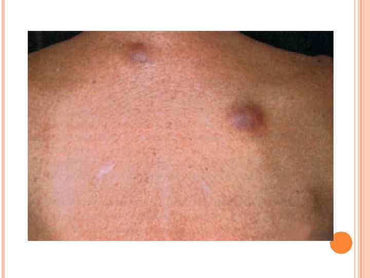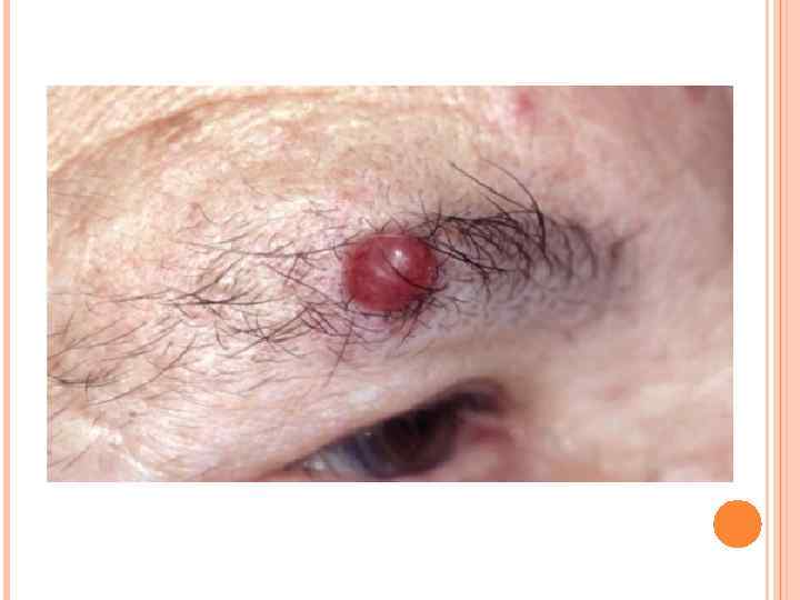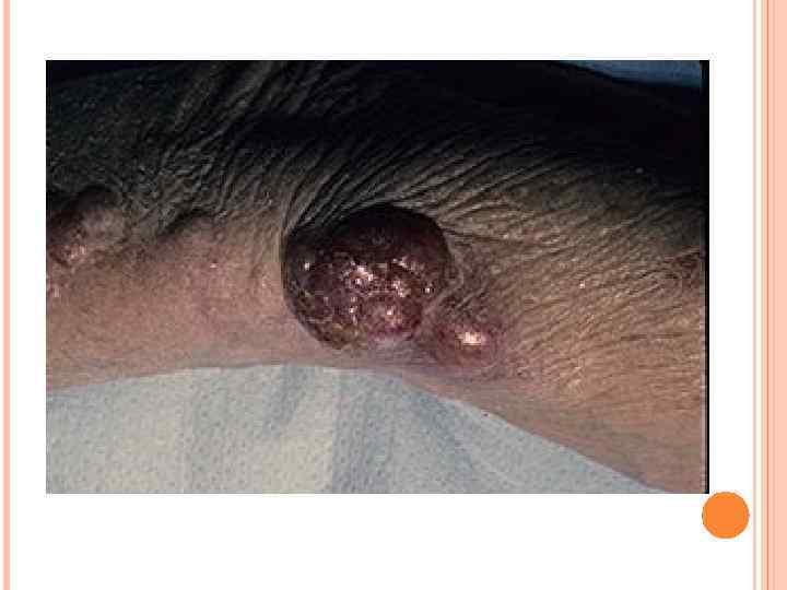 КЛИНИЧЕСКИЕ ПРОЯВЛЕНИЯ В виле единичного безболезненного однородного неизъязвленного красно– фиолетового узла Могут быть изъявления, сателлиты и мультифокальное расположение Чаще располагается на подверженных УФ– облучению участках кожи (голова и шея, конечности). На слизистых оболочках 5% от общего числа заболевших.