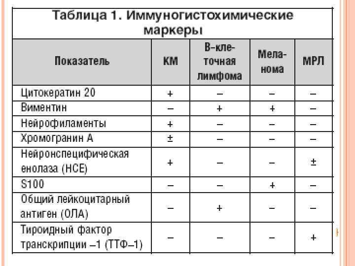 МОРФОЛОГИЧЕСКИЙ ДИАГНОЗ С учётом отсутствия характерных клинических особенностей диагноз РКМ в большинстве случаев ставится на основании морфологического исследования: Мелкие круглые клетки, распологающиеся в виде пластов и трабекул Пузырчатое ядро, незаметная нуклеола Хроматин по типу «соли с перцем» Минимальная цитоплазма Большое количество митозов