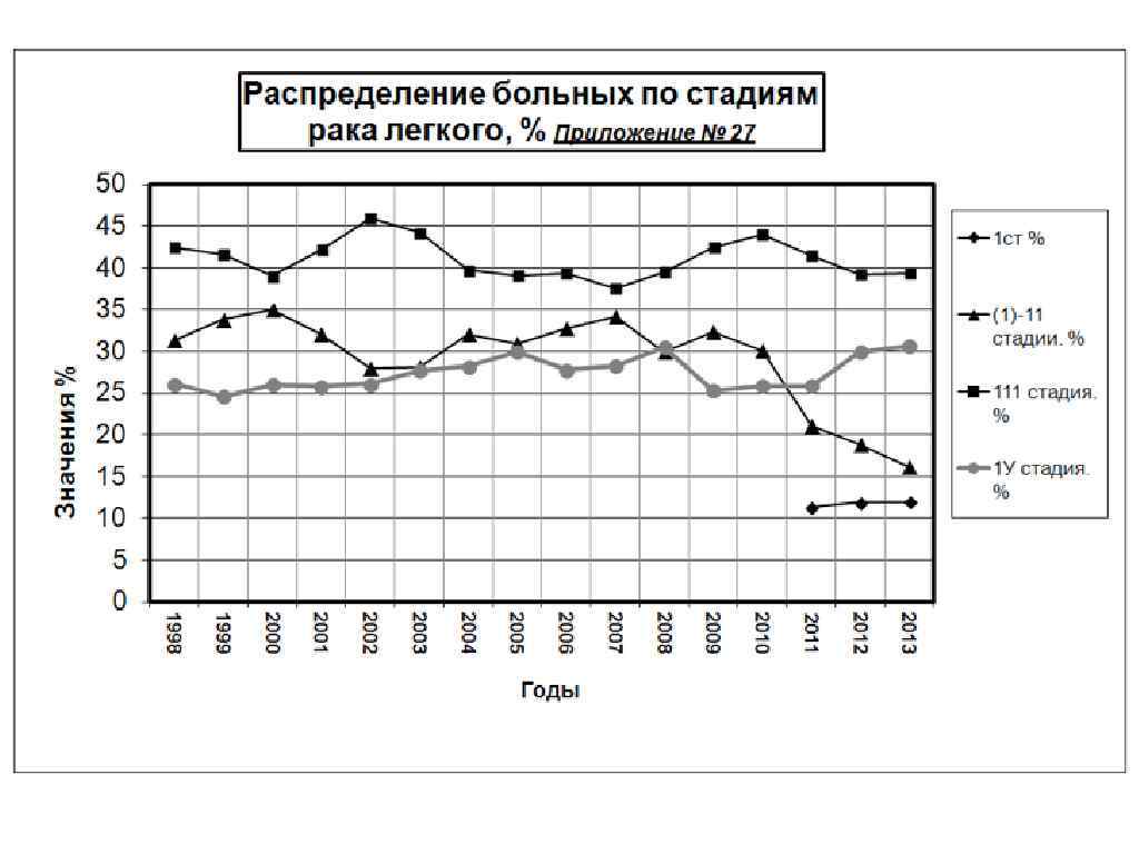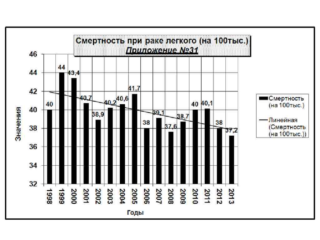 Рак легких в Кемеровской Области за 2013 г: на 1 месте рак молочной железы – 39, 6 на 100 т. н. , что составляет11, 7% на 2 месте рак легких – 38, 8 на 100 т. н. 11, 5% на 3 месте рак кожи – 35, 8 на 100 т. н. 10, 6% на 4 месте рак желудка – 22, 4 на 100 т. н. 6, 7% на 5 месте рак ободочной кишки – 19, 0 на 100 т. н. на 6 месте рак прямой кишки – 17, 2 на 100 т. н. на 7 месте рак предстательной железы - 17, 0 на 100 т. н. 5, 6% 5, 1% 5, 0% на 8 месте рак тела матки – 14, 5 на 100 т. н. 4, 3% на 9 месте рак шейки матки – 11, 2 на 100 т. н. 3, 3% на 10 месте рак яичников – 8, 8 на 100 т. н. 2, 6%