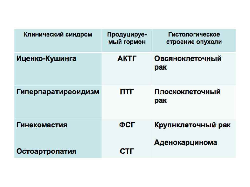 5. Пункция костного мозга. 6. Лабораторные исследования. 7. Определение опухолевых маркеров. Гормоноподобные субстанции выступают своеобразными маркерами малигнизации; их можно обнаружить радиоиммунологическим методами. Чаще всего обнаруживают АКТГ, уровень его секреции в сыворотке и моче нередко выше, чем при синдроме Кушинга и его труднее блокировать медикаментозно. 8. Функция органов дыхания (спирометрия). 9. ЭКГ, Эхо. КГ.