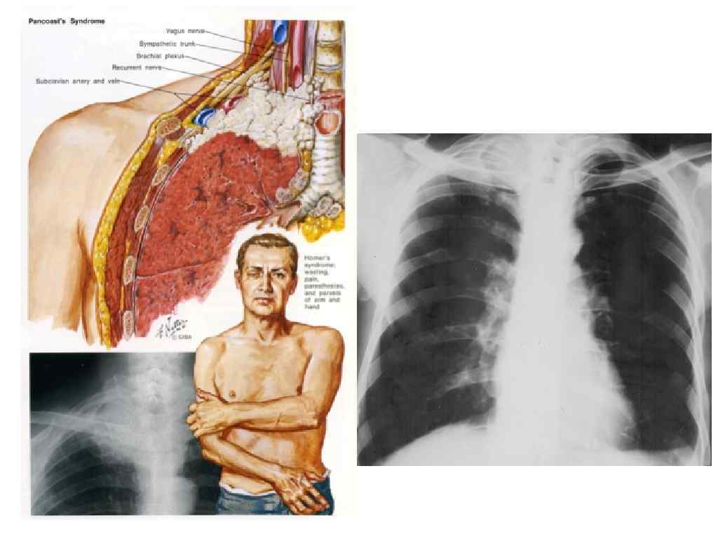 Рак Панкоста • • • Опухоль располагается в первом сегменте легкого, быстро прорастает купол плевры, головки первых трех ребер, межреберные нервы и элементы плечевого сплетения, что может вызвать боли по ходу нервных стволов, в плечевом суставе , позднее боли в межлопаточном пространстве и на передней поверхности грудной клетки и т. д. Больные при этом часто госпитализируются в неврологические отделения с диагнозом: плексит, плечелопаточный артрит. При вовлечении в процесс пограничного симпатического ствола и особенно звездчатого ганглия возникает синдром Клод Бернара-Горнера (птоз, миоз, энофтальм). При прорастании спиномозговых нервов С 7 -Th 1 -2 –слабость мышц кисти, парестезии и расстройства чувствительности участков кисти и предплечья. Кроме того, может нарушиться симпатическая иннервация сосудов кожи соответствующей половины туловища. Сосудистая сеть при этом расширена, выражена потливость.