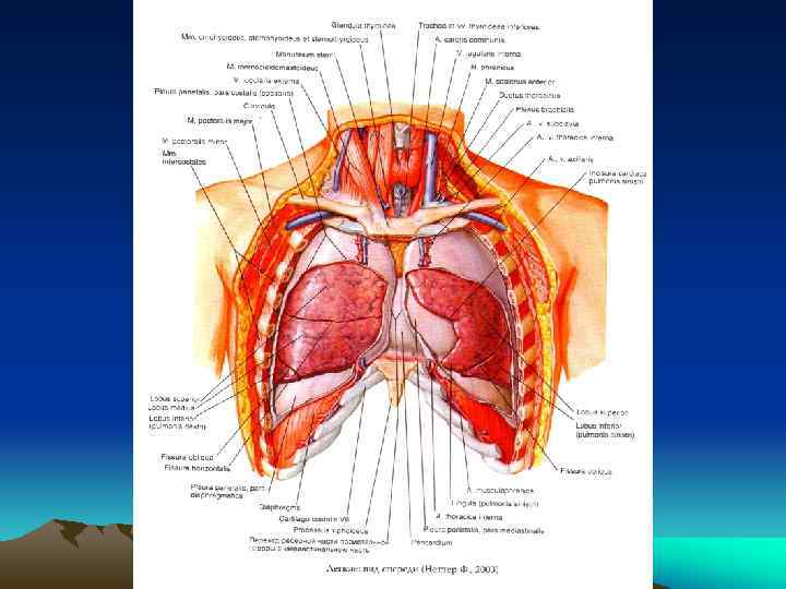 Лимфоотток • Собственная лимфатическая система каждой доли легкого (глубокая и поверхностная сети). • Регионарные лимфатические узлы: пульмональные, бронхопульмональные, верхние и нижние трахеобронхиальные, бифуркационные, паратрахеальные, средостенные.