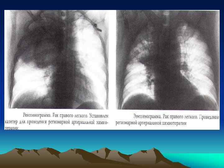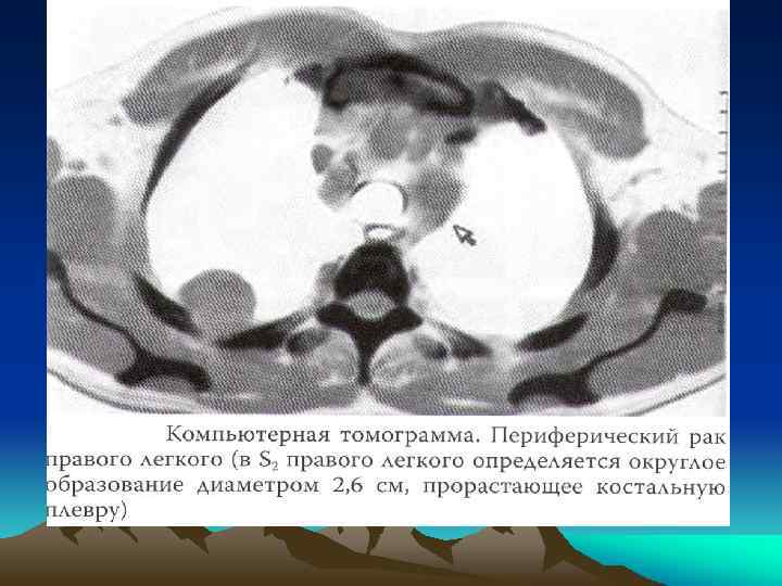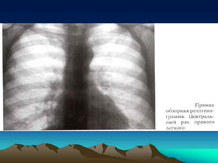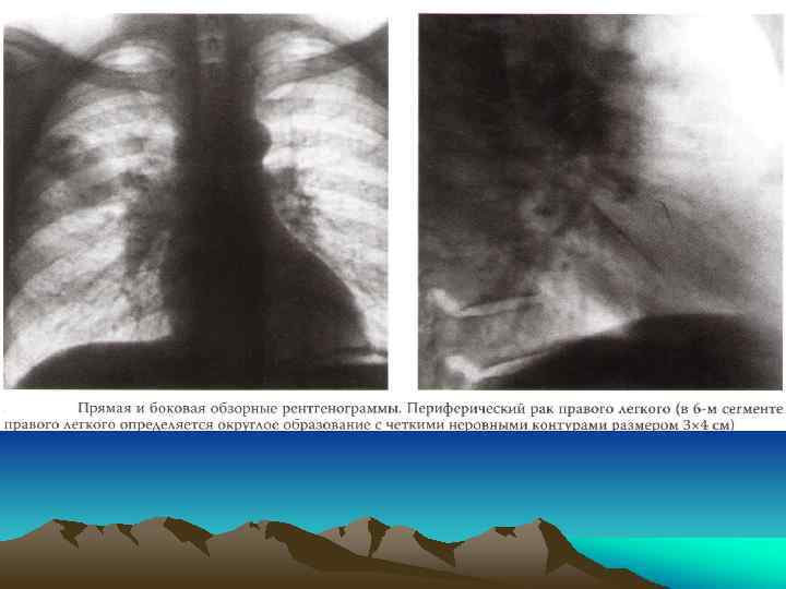 Рентгеносемиотика рака легкого • • Центральный 1. Гиповентиляция 2. Ателектаз 3. Сужение бронха вплоть до симптома ампутации • 4. Клапанная эмфизема • Периферический • 1. Форма тени опухоли • 2. Структура тени(распад) • 3. Характер контуров • 4. Изменение окружающей легочной ткани • 5. Изменения плевры
