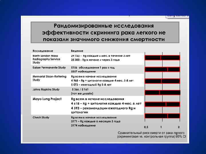 Рак легкого Скрининг ● Результаты «раннего» исследования Национального иститута рака (США) в популяционной группе высокого риска (Цитология мокроты каждые 4 месяца + ежегодная флюорография грудной клетки) – Более частое выявление ранних стадий РЛ в популяции подвергнутой скринингу (40% в группе скрининга против 15% в группе без скрининга) – 5 -летняя выживаемость в скрининговой группе составила 35% против 13% в общей популяции – Нет различий в общей смертности ● Результаты PLCO исследования (Prostate, Lung, Colorectal and Ovarian Cancer Screening trial): преимущество ежегодной флюорографии грудной клетки в выявлении ранних стадий. http: //www. cancernet. nci. nih. gov/ Ginsberg RJ, et al. Cancer: Principles and Practices of Oncology. 6 th ed. 2001; 925 -983.