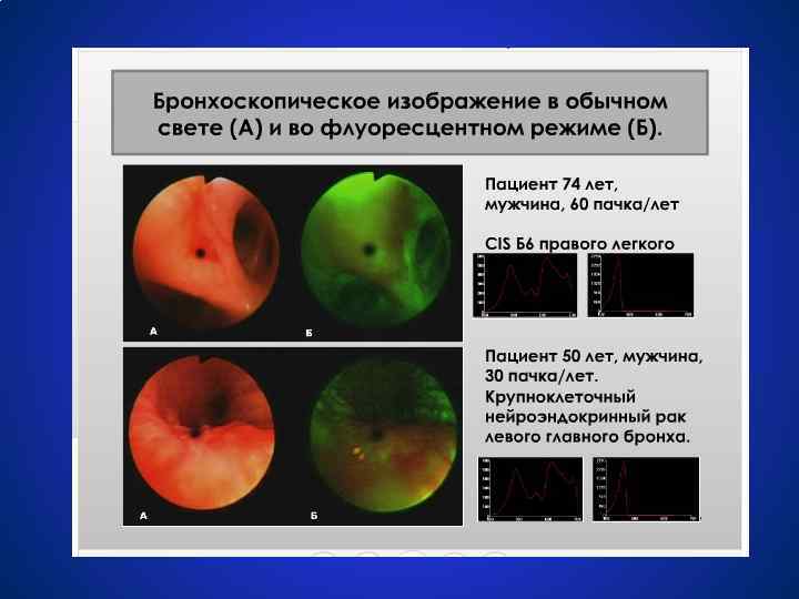 Бронхоскопия • • Бронхоскопия считается обязательной при подозрении на рак лёгкого Позволяет визуально исследовать трахею, главные, долевые, сегментарные, субсегментарные бронхи и, в некоторых случаях, бронхи 6 -го, 7 -го и более порядков. При этом можно непосредственно увидеть опухоль и осуществить её биопсию, в том числе трансбронхиальную биопсию легкого, лимфоузлов, средостения Бронхоскопия флюоресцентная