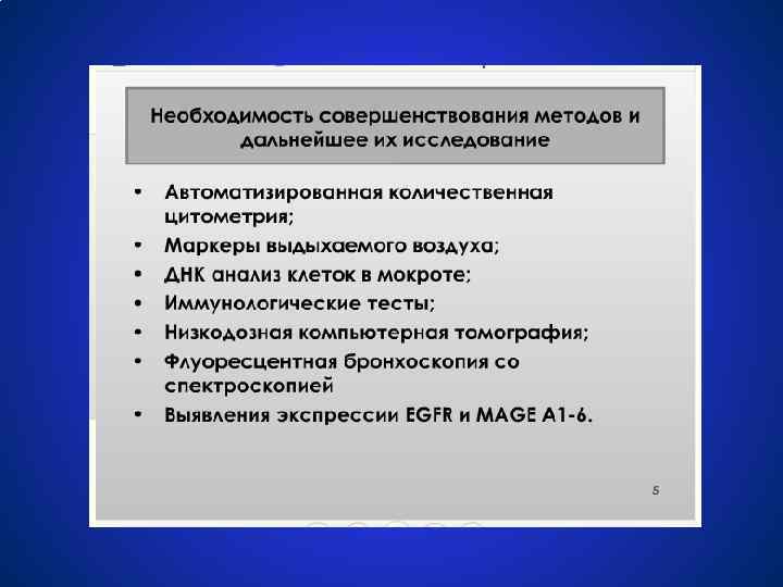 Мелкоклеточный рак легкого выживаемость и прогноз 5 -летняя выживаемость: I стадия: 60 -70% больных II стадия: 41% III стадия: 18% § При плоскоклеточном раке – 34% § При аденокарциноме – 33% § При недифференцированном раке – 7, 7% IV стадия: около 10% ● Только хирургическое лечение дает 5 -летнюю выживаемость не более чем у 25 - 40% больных. ● Средняя продолжительность жизни после ЛТ 16, 7 - 18, 9 мес. , достигая 2 -3 лет, а иногда и 5 лет (10%) ● Комбинированное лечение дает выраженный эффект у 75% больных, у 25 – 45% полное исчезновение признаков заболевания, однако средняя продолжительность жизни составляет 8 – 13 мес. Более 2 -х лет имеют шанс прожить больные с полной регрессией заболевания