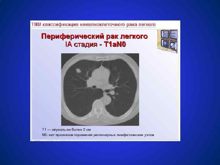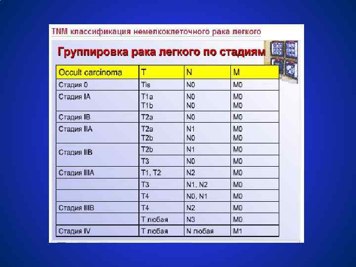 ОККУЛЬТНЫЙ РАК ЛЁГКОГО (TXN 0 M 0) ● Пациенты подлежат динамическому наблюдению (рентгенография органов грудной клетки, компьютерная томография, бронхоскопия) до обнаружения первичной опухоли. В последующем тактика лечения определяется в соответствии со стадией опухолевого процесса.