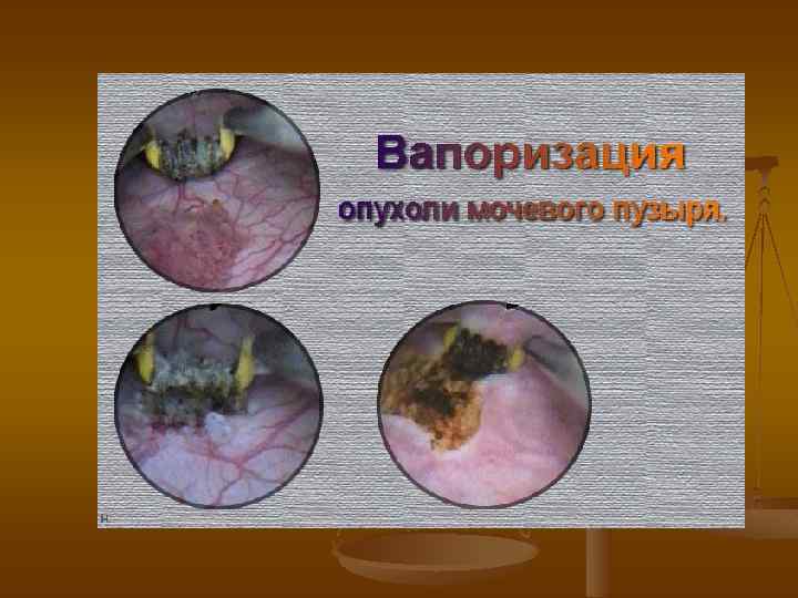 Флюоресцентная диагностика n n n 1. 2. повысить диагностические возможности цистоскопии позволяет применение флюоресцентной диагностики рака мочевого пузыря метод разработан Kriegmair в 1996 г. метод основан на: избирательном накоплении протопорфирина IX в опухолевых клетках при внутрипузырном введении 5 -аминолевулиновой кислоты при освещении мочевого пузыря синефиолетовым светом возникает флуоресценция опухоли