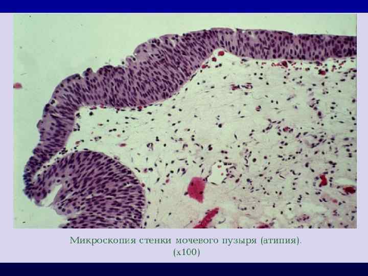 q § § § § Симптомы и признаки Бессимптомное течение (20%); Гематурия (85 -90%), вплоть до тампонады Боль над лоном, в промежности, связанная с мочеиспусканием или постоянная; Симптомы раздражения (учащенное мочеиспускание, императивные позывы) → рак in situ? ; Пальпация образования в мочевом пузыре → вероятна мышечная инвазия; Гепатомегалия, лимфаденопатия →MTS? ; Отёки нижних конечностей → регионарные MTS? ; признаки ХПН → обструктивная нефропатия?