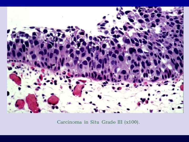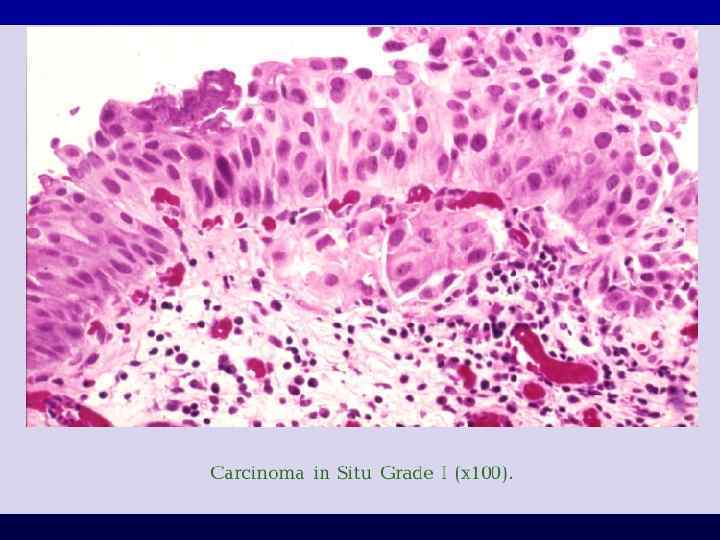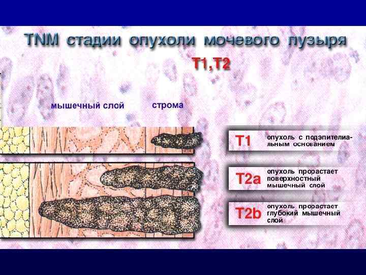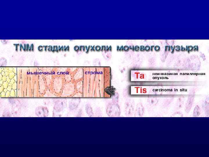 Поверхностный рак мочевого пузыря (Ta, T 1, Tis) Ta – папиллярная опухоль из уротелия, которая не проникает в lamina propria и мышцу мочевого пузыря; T 1 – опухоль из уротелия, прорастает базальную мембрану, которая разделяет эпителий и субэпителиальную ткань. T 1 распространяется через субэпителиальную ткань в lamina propria, но не прорастает в мышцу; Tis – рак высокой степени злокачественности, ограниченный уротелием, имеет «плоский» вид (едва возвышается над поверхностью, красноватая, волнистая , иногда невидимая). Tis может быть локальной или диффузной, сочетаться с другими опухолями.