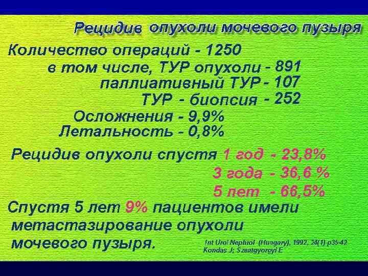 Адьювантная терапия Так как имеется высокий риск рецидивирования и прогрессирования опухолей мочевого пузыря после ТУР, рекомендуется профилактическая химио- или иммунотерапия в виде применения внутрипузырных инстилляций при всех поверхностных видах опухолей (Ta, T 1 and Tis)